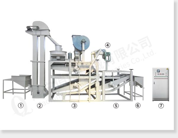 ① input hopper ② bucket elevator ③ main part of the equipment(dehullers,air separator and seed-kernel separator) ④ pneumatic system of back-flowing materials ⑤ seed-kernel reseparator ⑥ kernels bin ⑦ electric control cabinet