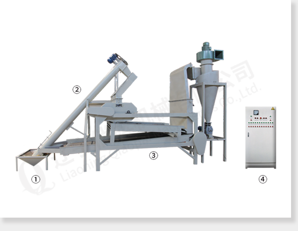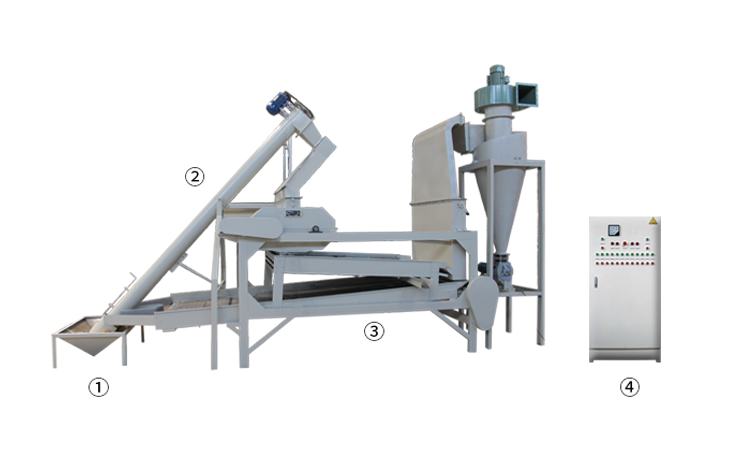 ①input hopper ②auger conveyor ③main part of the equipment(dehullers, air separator and seed-kernel separator) ④electric control cabinet