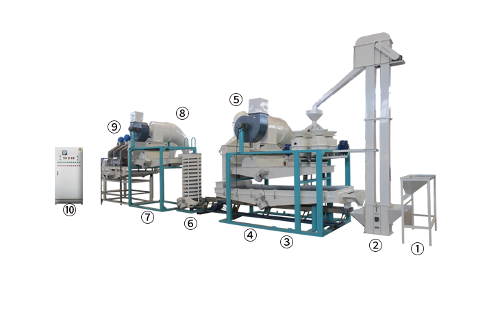 ① 上料斗② 斗式提升機 ③ 脫殼、風(fēng)選、分選主機 ④ 板簧輸送機 ⑤ 立式風(fēng)選系統(tǒng) ⑥ 螺旋提升機 ⑦ 振動輸送風(fēng)選機 ⑧ 立式風(fēng)選系統(tǒng) ⑨ 靜電風(fēng)選機 ⑩ 電氣控制柜