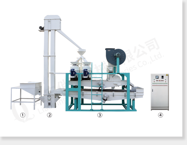 ① 上料斗② 斗式提升機(jī) ③ 脫殼、風(fēng)選、分選主機(jī) ④ 電氣控制柜