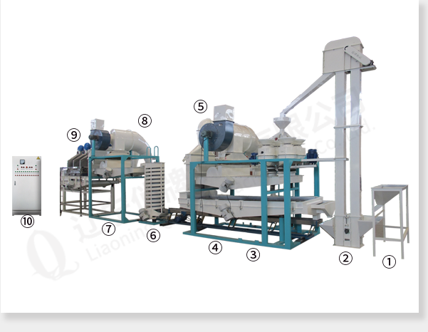 ①приёмный бункер ②ковшовый элеватор ③главная машина (шелушитель, вибросито для удаления шелухи и вибросито для сепарации нелущённой семечки и ядра)④рессорный транспортёр ⑤вертикальное пневматическое устройство ⑥спиральный элеватор ⑦ вибротранспортный ветросепаратор ⑧вертикальное пневматическое устройство ⑨электростатический ветросепаратор ⑩электрический управляющий шкаф